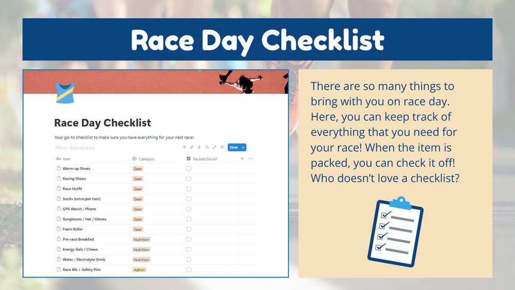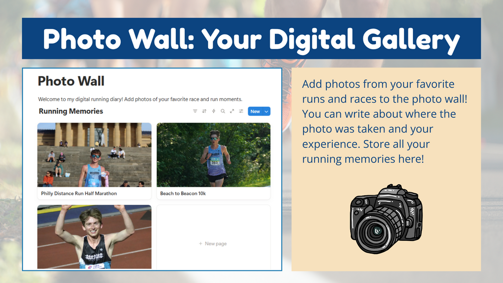 - Each feature (weekly log, gear tracker, reflections, photo wall, race day checklist) is its own linked page or database for easy navigation.