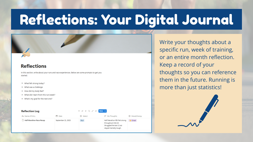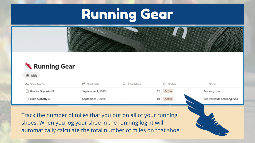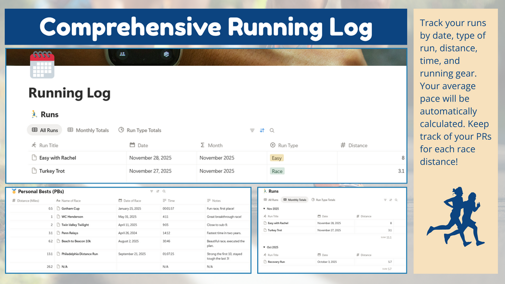 The Running Training Tracker is built in Notion and designed to be intuitive and flexible: